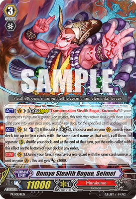 The deck will be based around the legion pair Onmyo Stealth Rogue, Seimei and Transformation Stealth Rogue, Kuzunoha. The Legion skill for Seimei is quite good. For 1 Counter Blast you can fill up your whole front row with rearguards from the deck (specifically copies of the vanguard meaning, either Kuzunoha or Seimei). Kuzunoha's ability is that when she is called while your vanguard is in legion you can Soul Blast 1 to put a copy of a rearguard from your deck into play for the turn. (I will refer to this as "Copying" from now own.) So with these you can easily fill up your field temporarily which will let you dodge retiring and locking effects. Cost $4 for a pair (from Ebay.com buy it now listing) Although if you have friends who bought a lot then you probably can grab them for even cheaper
